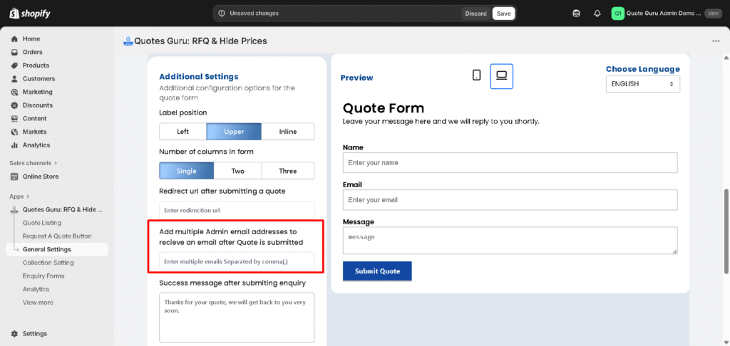 Managing quote requests efficiently often requires involving multiple team members or departments or wide range of customers having there personalized preferences. With the Quotes Guru app, you can easily set up multiple email addresses to receive quote request notifications, ensuring that no inquiry goes unnoticed. This feature is especially useful for businesses with dedicated sales, support, or order processing teams. In this quick guide, you’ll learn how to add multiple email recipients to the quote form so that everyone who needs to stay informed is kept in the loop.