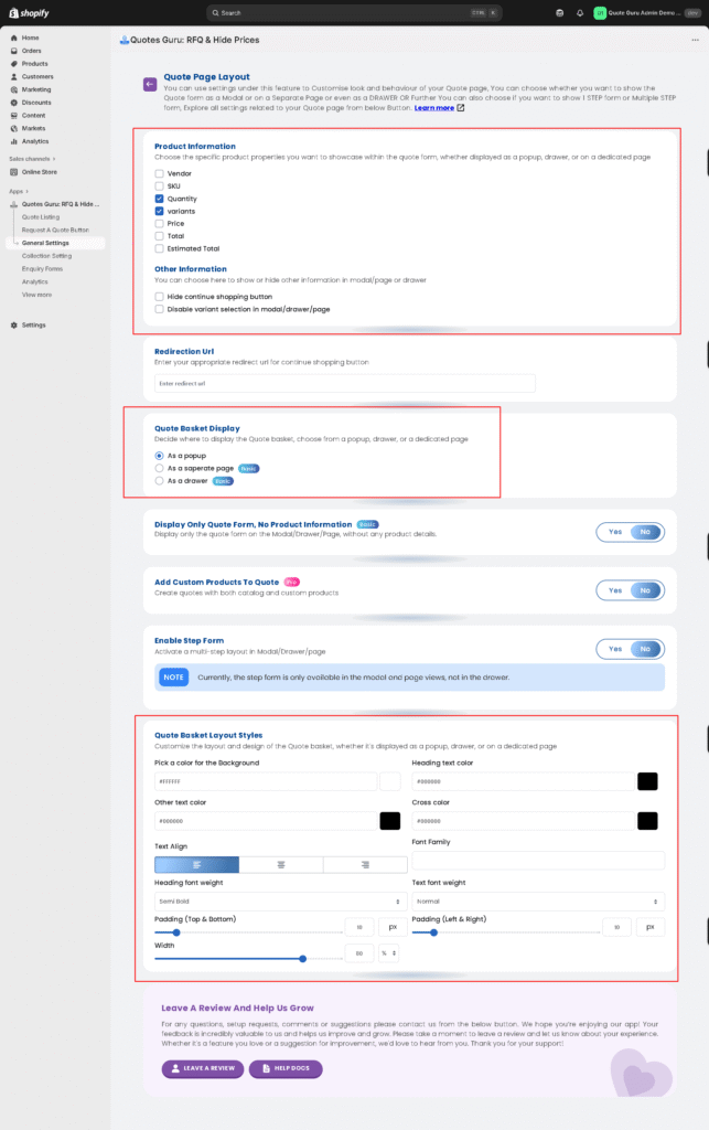 The Quote Page Layout controls how your customers experience the quote process on your store. Whether your quote form appears as a popup, drawer, or dedicated page directly impacts how smoothly customers can review items and submit their inquiries. By customizing layout settings, product details, displays, and styles, you can create a quote experience that aligns with your brand and supports higher conversions.
