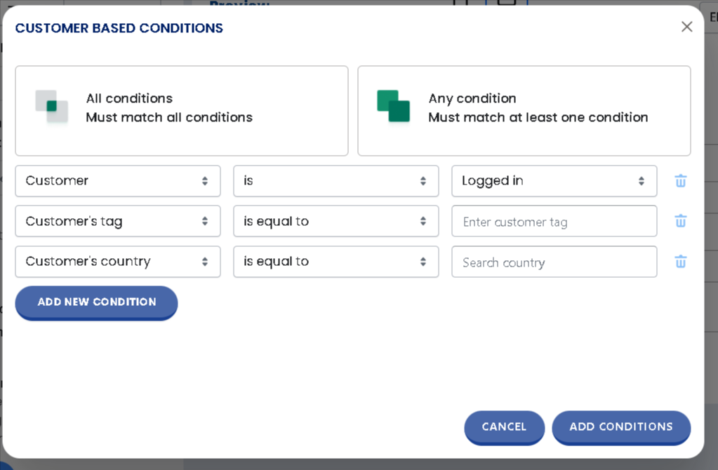 Customer-Based Conditions allow you to control which quote form is shown to different customers based on who they are. Using this feature, you can display different quote forms depending on a customer’s login status, customer tags, or country—without any custom development.