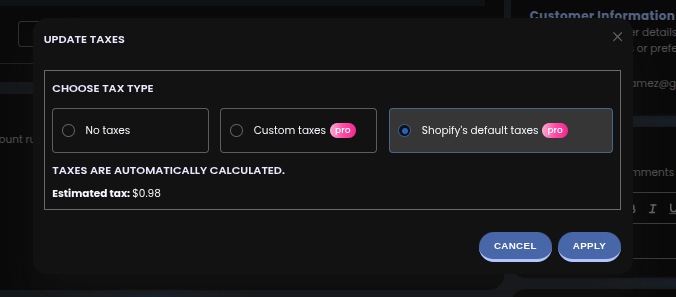 However, please note that manual taxes won’t apply when converting a quote into a draft order, since Shopify automatically calculates taxes and does not support manual tax entries.