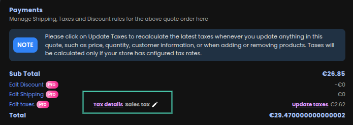 If you’ve updated the customer information, product price, quantity, or added/removed products, just click the Update Taxes button.