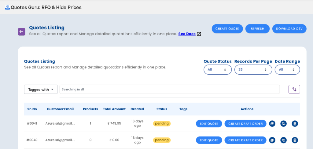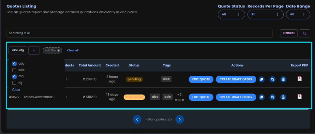 Merchants can filter quotes using tags to segment and organize quotes more effectively.