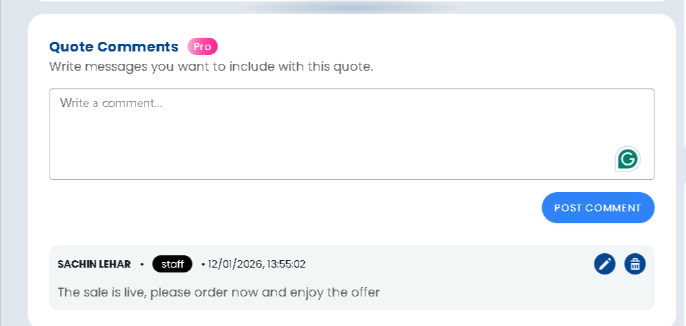 Quote Comments allow you to add notes directly to a quote for better communication and tracking. You can use comments to share additional details with customers or leave internal notes for your team. This helps keep all quote-related discussions organized in one place.