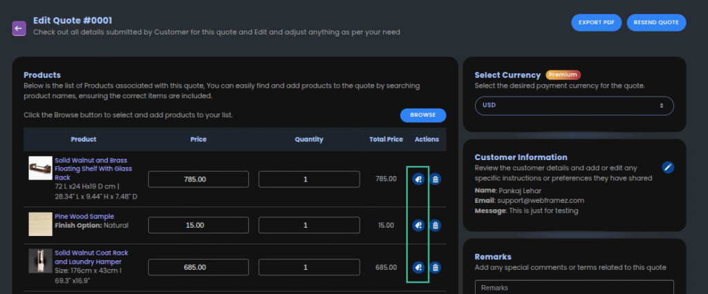 This section displays all products associated with the quote. You can add or edit products using the following options: