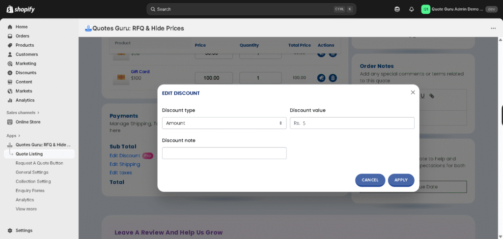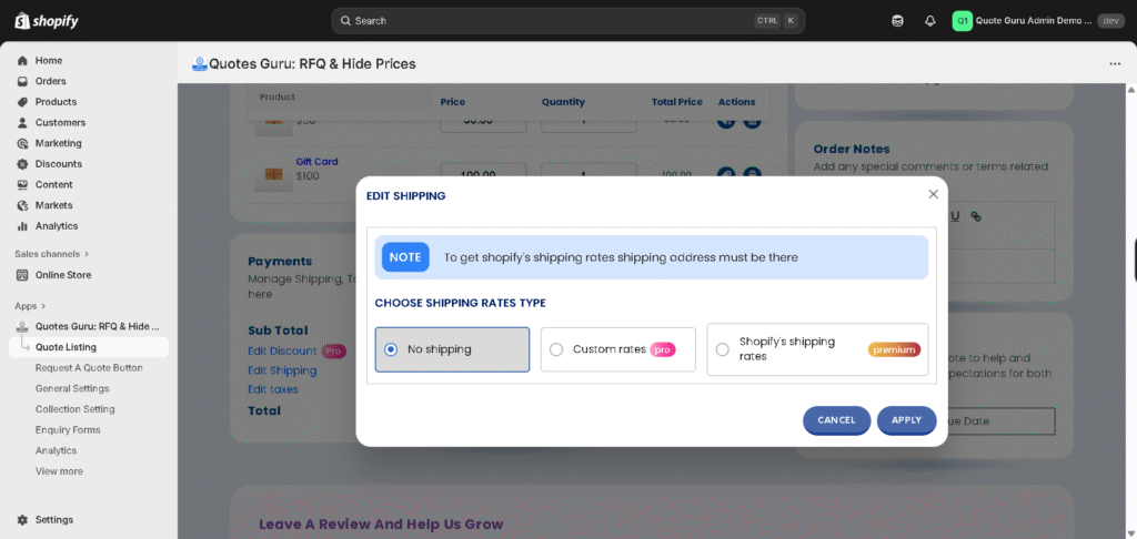Quotes Guru gives you flexible shipping options when creating quotes, allowing you to apply no shipping, custom shipping charges, or Shopify’s automatic shipping rates. This helps you control costs, match real shipping scenarios, and avoid surprises for your customers.