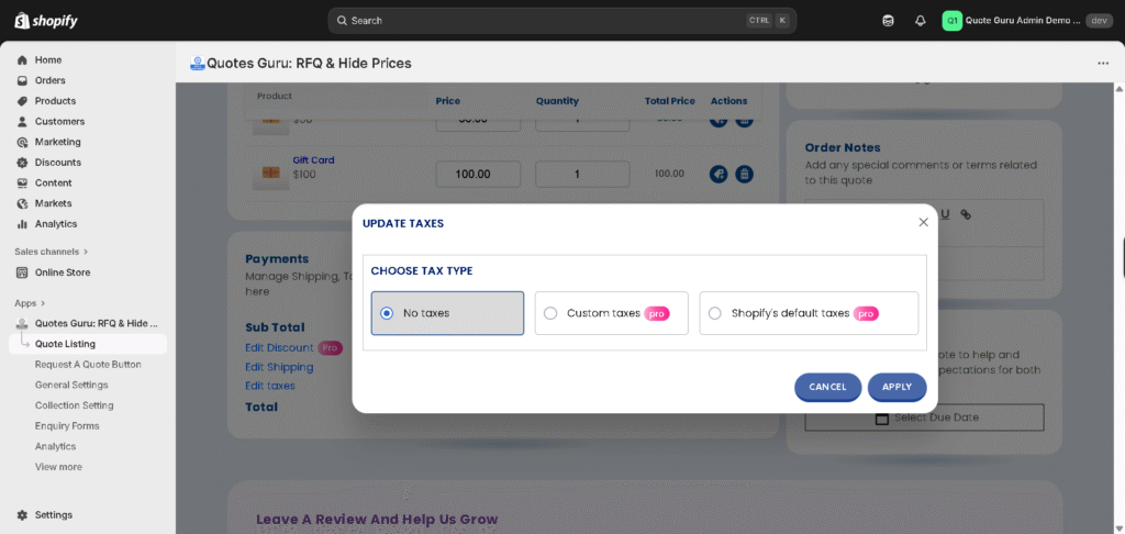 The Manage Taxes in Quotes feature lets you control how taxes are applied to individual quotes. You can apply store tax settings, adjust tax amounts, or exclude taxes based on your business needs, ensuring accurate pricing and compliance before a quote is sent to the customer.