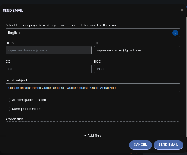 The Resend Quote Email feature allows you to quickly resend a quote to your customer with full control over email content, attachments, and delivery settings. This is especially useful when a client requests updates, misses the original email, or needs the quote in a different format or language.