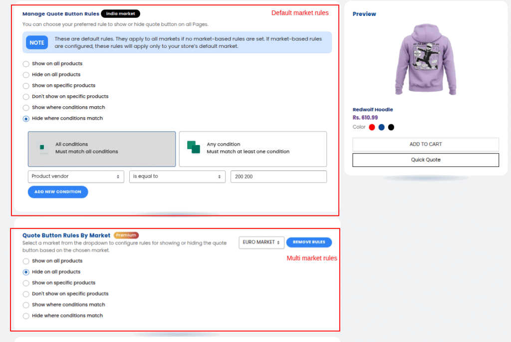 - Result: Indian customers see the Quote Button only on expensive items; other markets see it on all products.