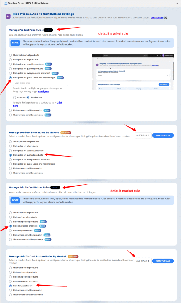 “Quote Button Rules by Market” or “Price/Cart Rules by Market”