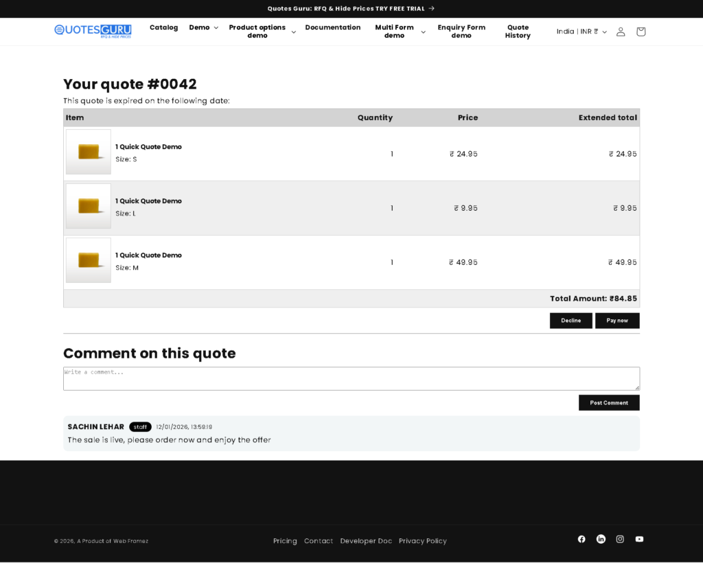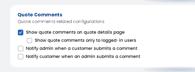 The Quote Comments feature allows merchants and customers to communicate directly within a quote. This helps keep all discussions, clarifications, and updates centralized, reducing back-and-forth emails and improving quote conversion efficiency.